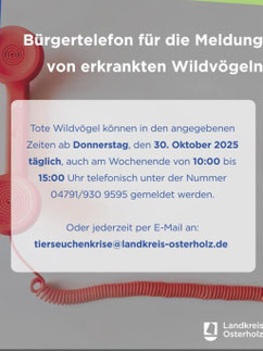 Im Landkreis Osterholz gehen derzeit vermehrt Meldungen über tot aufgefundene oder krank wirkende Wildvögel, insbesondere Kraniche, ein. Bei einem im Landkreis gefundenen Kranich wurde das Influenzavirus H5A nachgewiesen. Ob es sich dabei um die hochpathogene Form der Geflügelpest handelt, steht derzeit noch nicht fest. Das abschließende Ergebnis der weiterführenden Diagnostik liegt noch nicht vor.